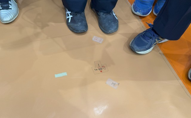 見学の最後にはスタジオにも入らせていただき、足元にある斎藤さんのバミリを見つけて子どもたちは大喜びでした!