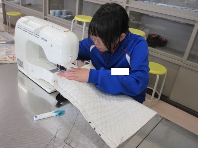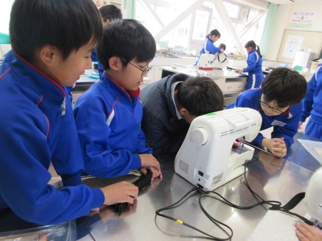 ミシンで真剣にトートバッグを作っている子どもたち。