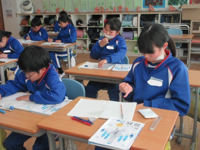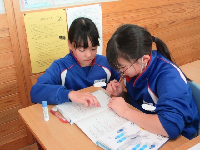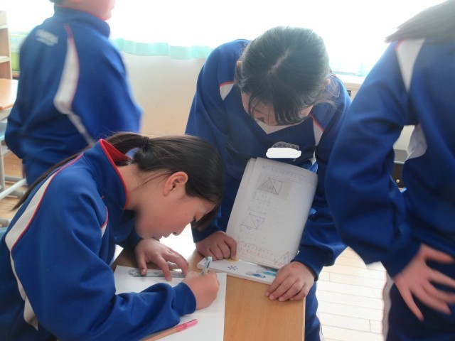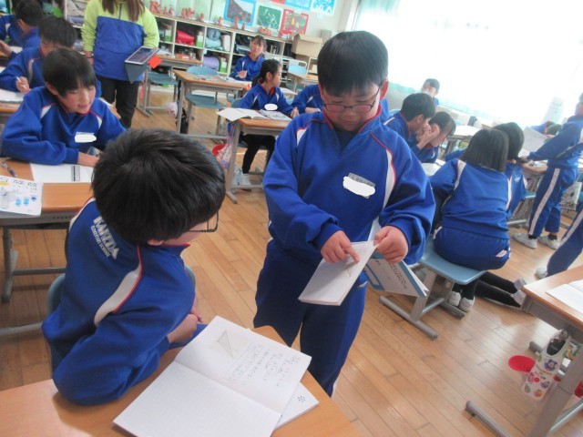 5年生の算数です。どこが底辺でどこが高さになるのかなど、分かったことや気づいたことを友達と共有しながら三角形の面積を求めました。