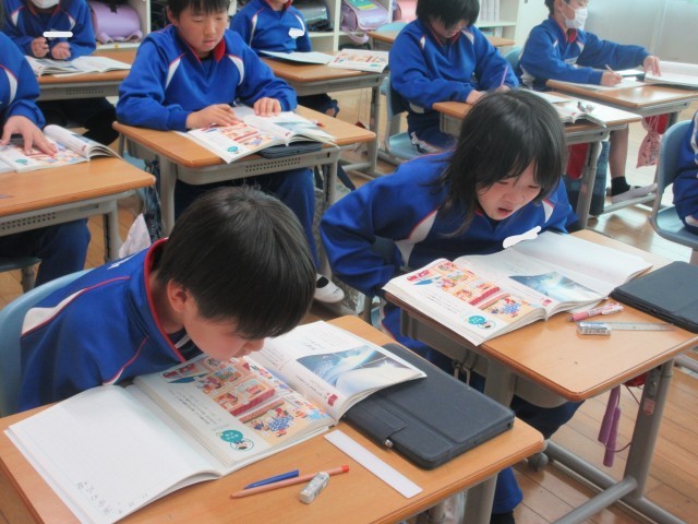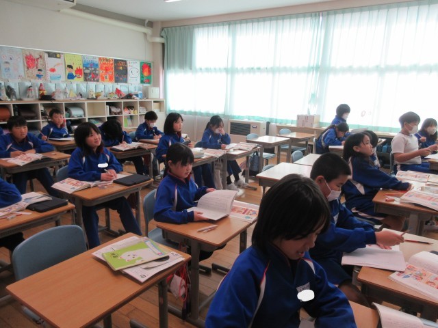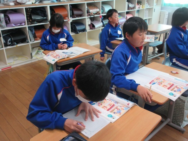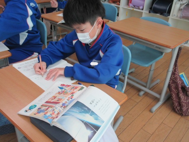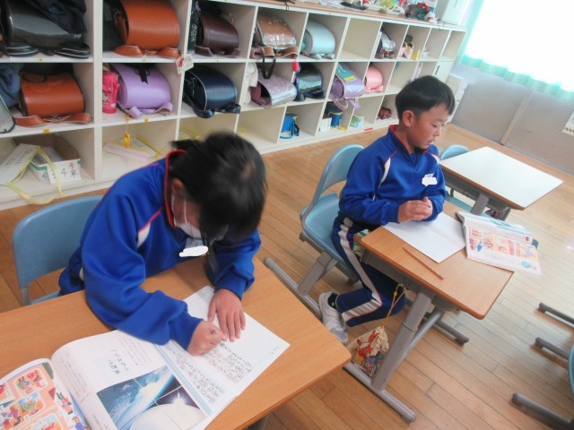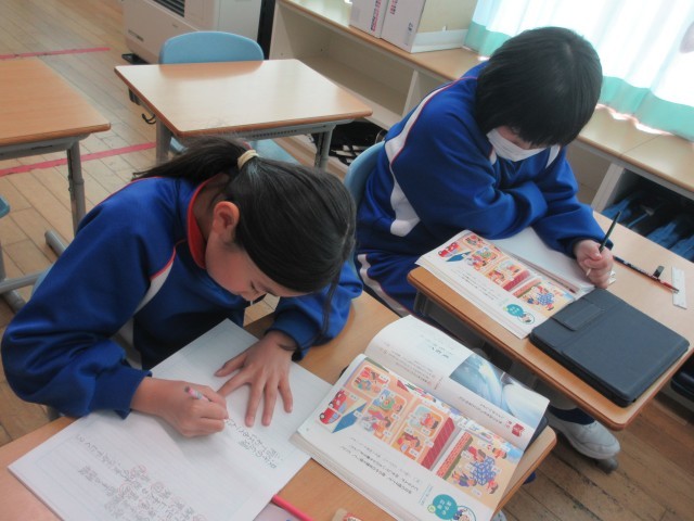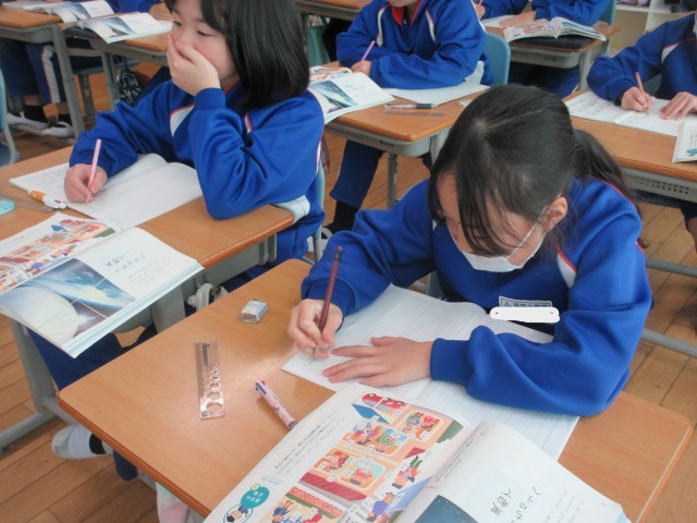 4年生の国語です。今まで学習した漢字を使い、絵に合うように文章を考えていました。