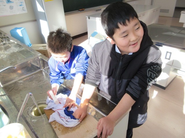 準備室にあった洗濯板を使ってみることに。固形石けんや液体洗剤を使い、ごしごしこすっていくうちに、だんだんとシミは薄くなってきました。
