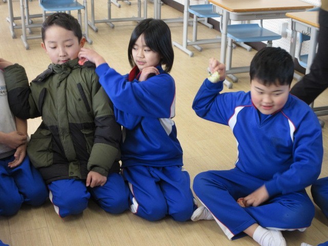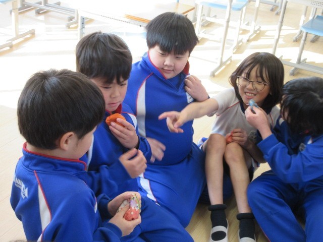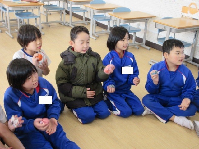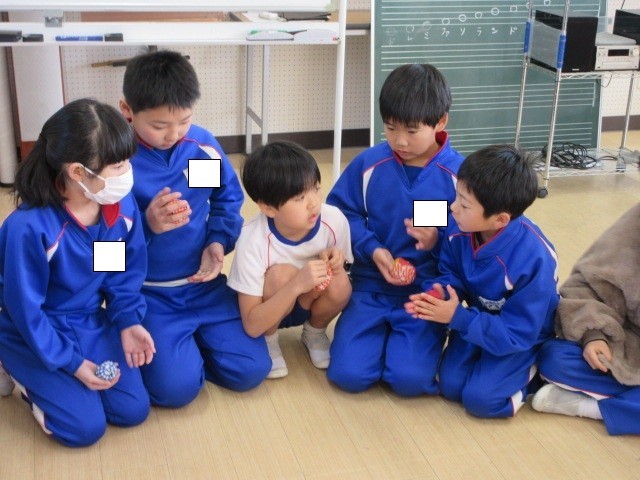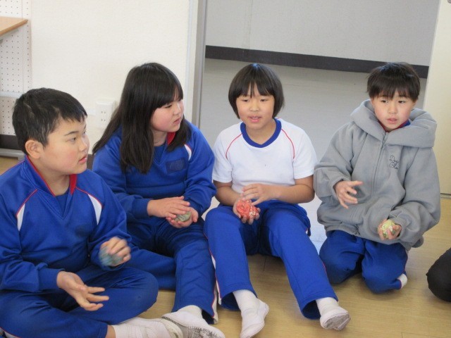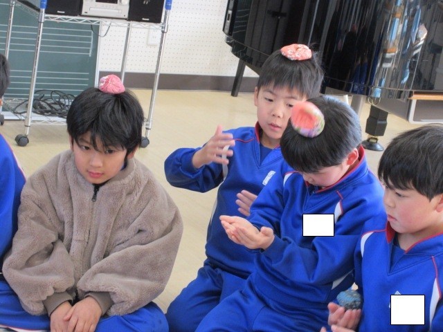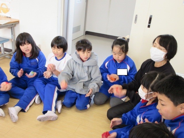 最初に、みんなでお手玉を使ってわらべ歌を歌いました。