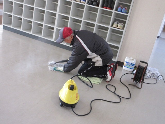 汚れが目立つ教室や廊下をスチームの蒸気を利用して、庁務員さんがきれいにしてくれています。