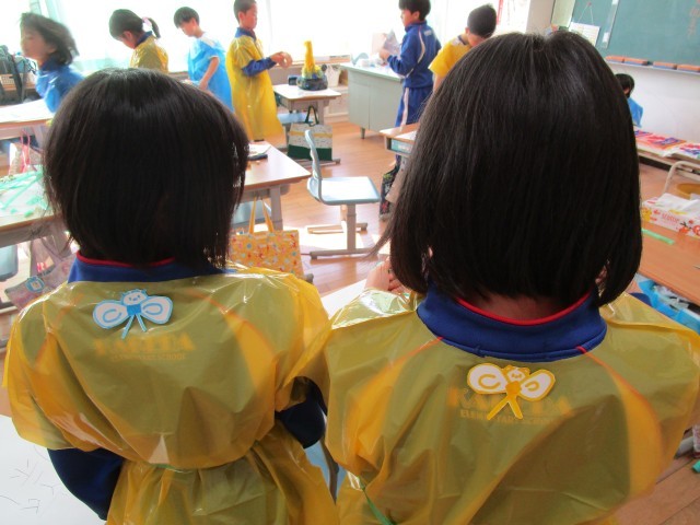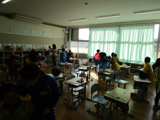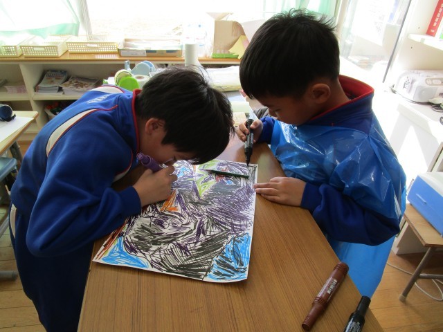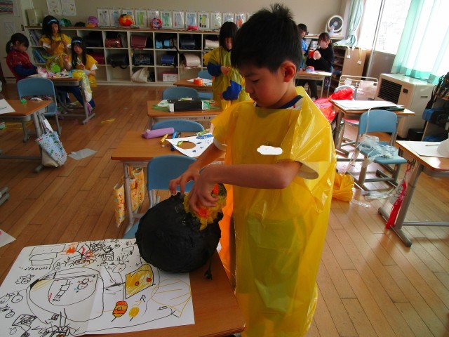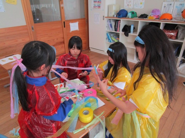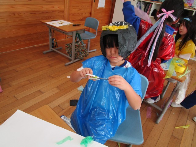 2年生の図工です。なりたいものを思い浮かべて、お花紙ではりこのお面をつくり、かぶって楽しみました。