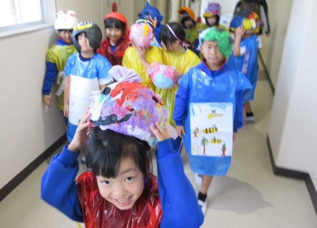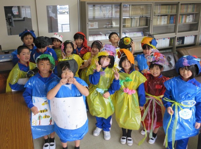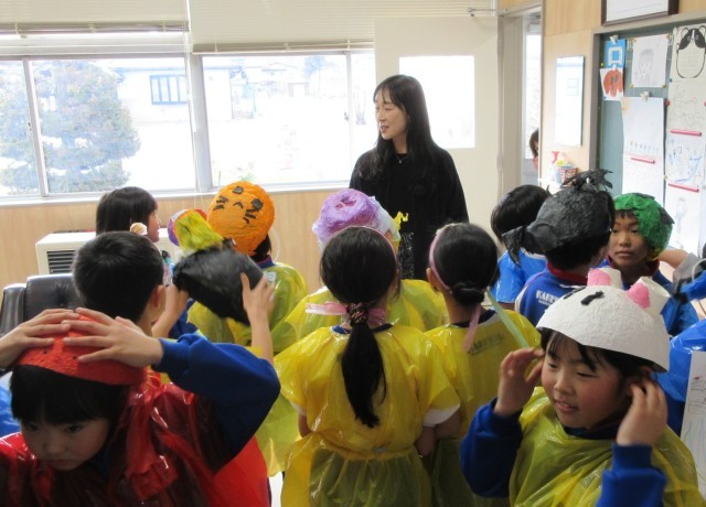 2年生が図画工作の学習で作った「おめん」と「いしょう」で大変身!!