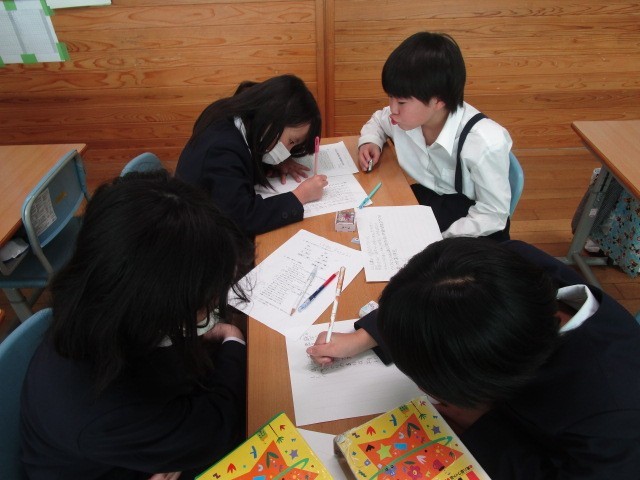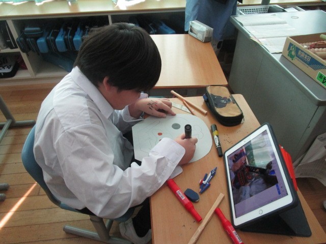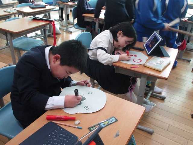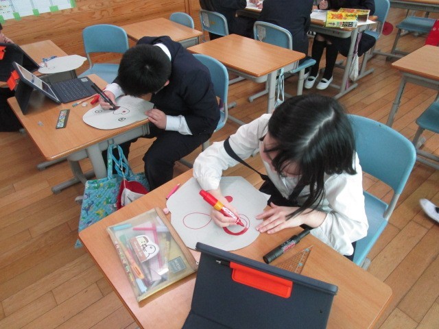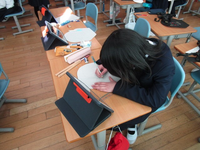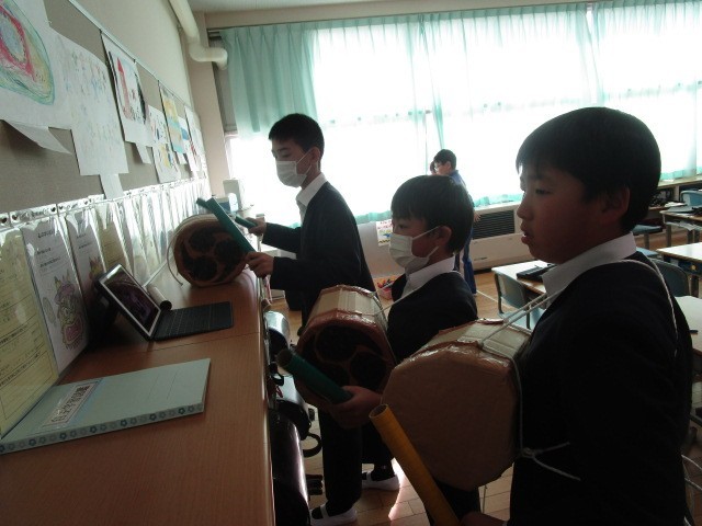 4年生の総合です。大石北又獅子舞の発表に向けて、お面や動き発表原稿の準備をしていました。