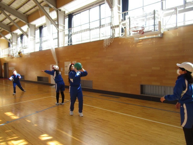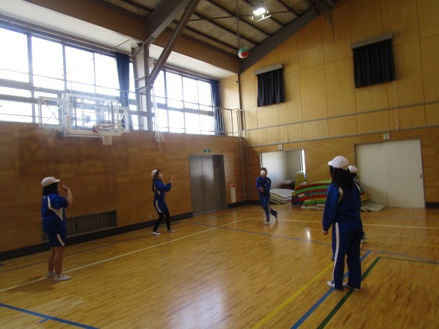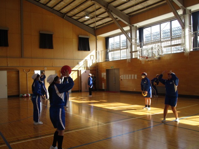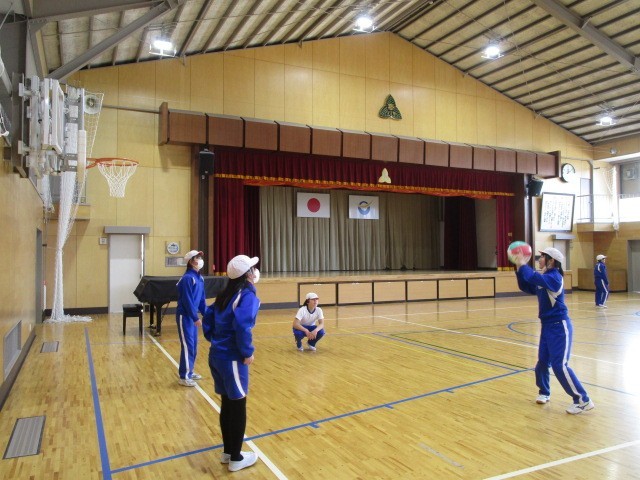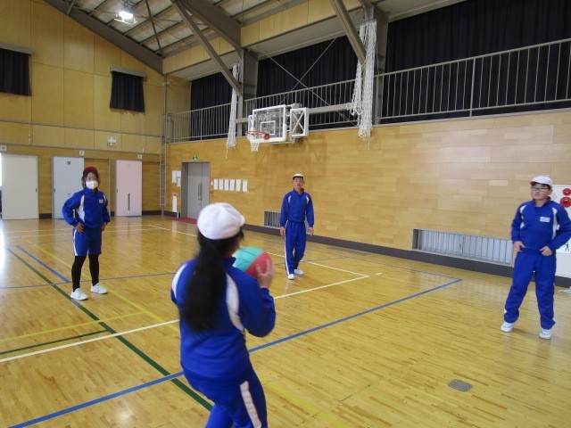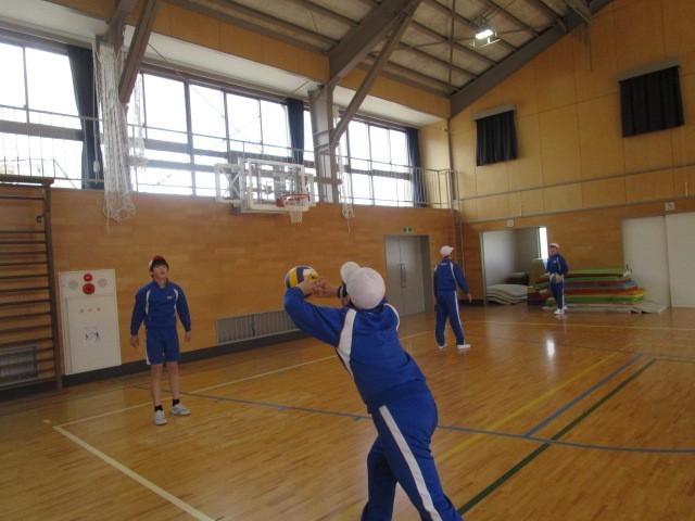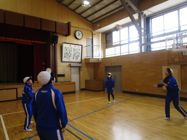 6年生の体育です。ソフトバレーボールのパスの練習をペア、グループで行いました。
