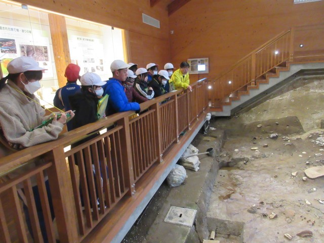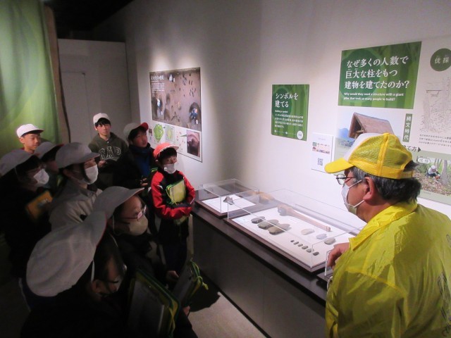 施設の方の説明をお聞きしながら、発掘された土器や土偶、復元された建物などを見学しました。