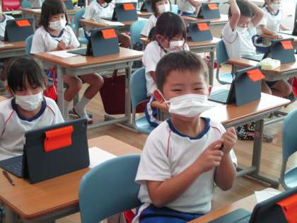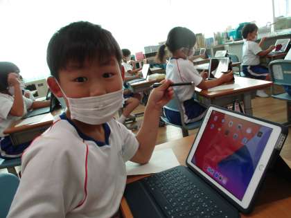 なんと、1年生がタブレットを持ち帰るための設定に成功しました!そして最後はmeetで大盛り上がり!すぐそばにいる友達でも、画面を通すとなんだかうれしい!分かります、その気持ち♪