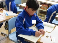 アルファベットクイズをした3年生。大文字と小文字バージョンを行いました。「大文字は分かるけど、小文字は難しいなあ」「あー!それも隠れていたのか!」友達と協力して行うことができました。