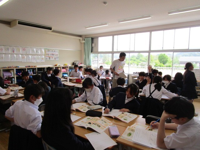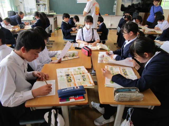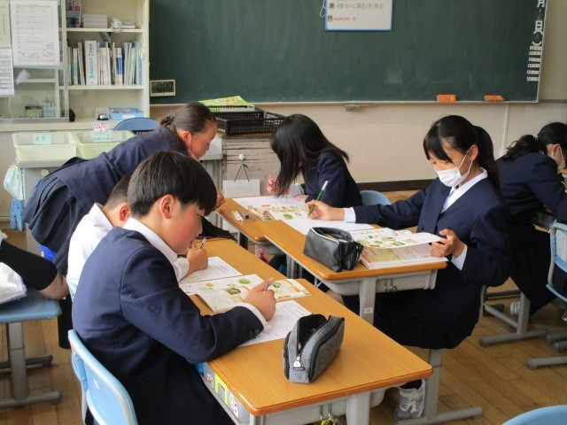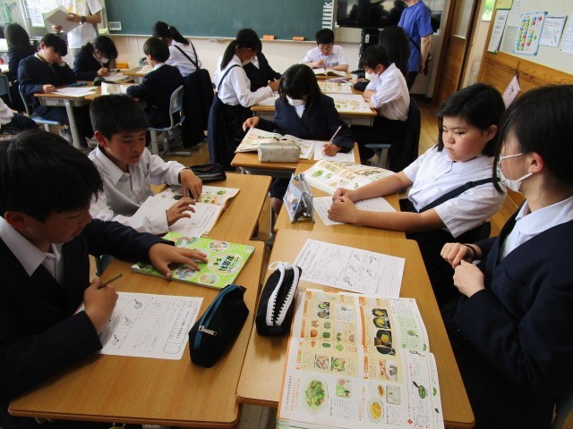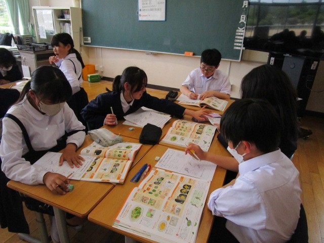 6年生の家庭科です。調理実習に向けて、野菜いためとスクランブルエックの作り方を確認したり、グループごとに役割の分担をしたりフライパンの使い方を確認したりしました。