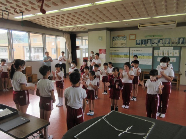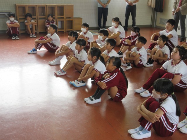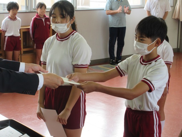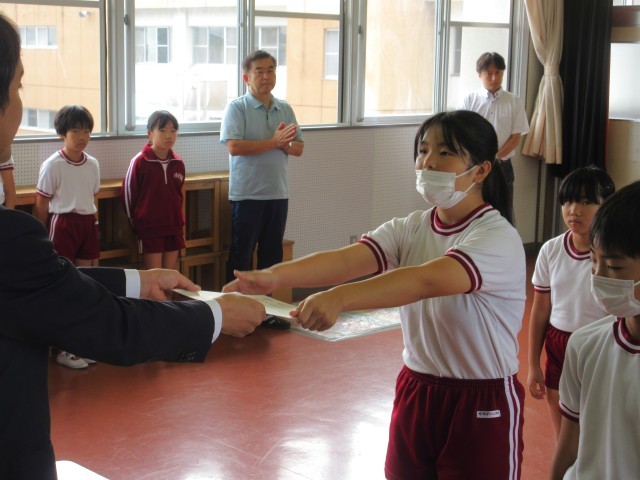 まず、先日行われた市陸上記録会の記録証を校長先生からいただき、応援してくれていた在校生から拍手をもらいました。