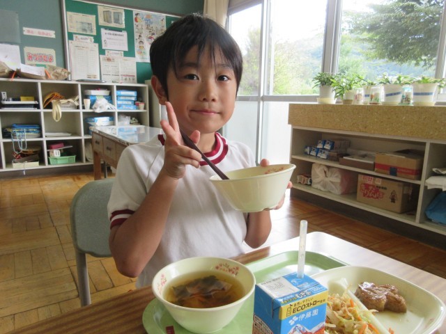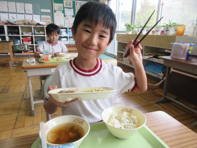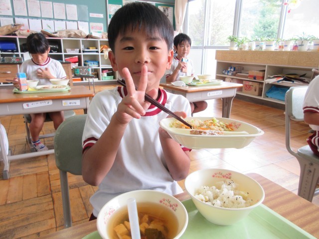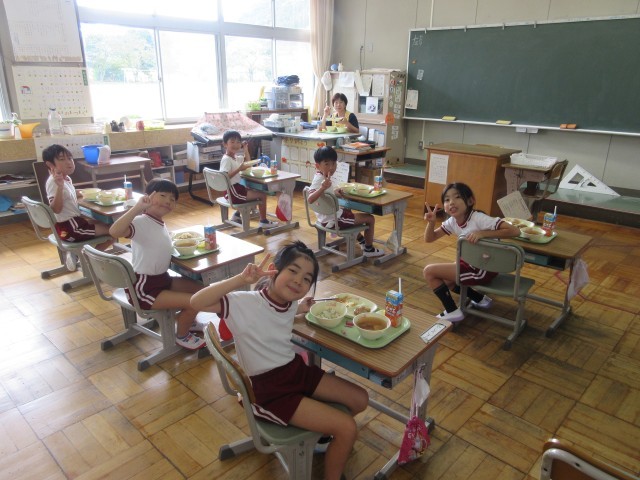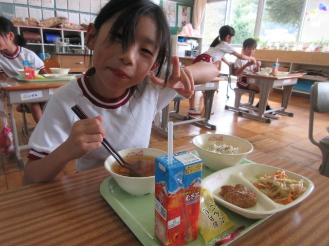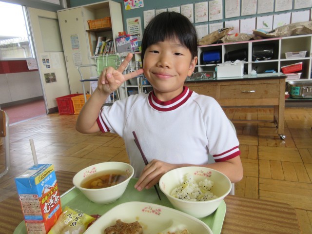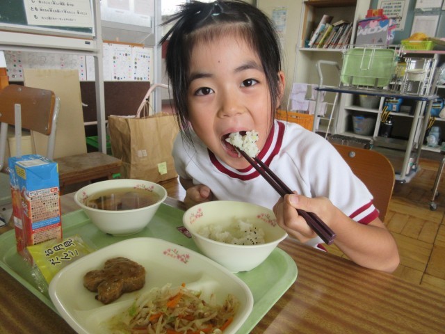 さつまいもごはん、すまし汁、おかか和え、うさぎハンバーグみたらし、麦茶、お月見デザート(みたらし団子)でした。