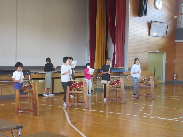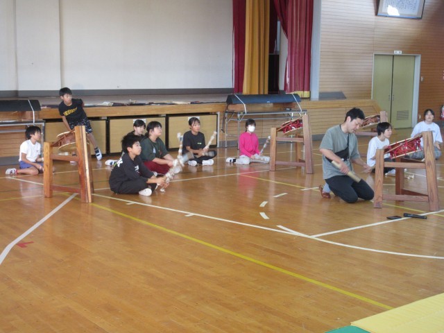 今日の5時間目、5・6年生は講師の方をお招きして、霊山太鼓のリズムを教えていただきました。