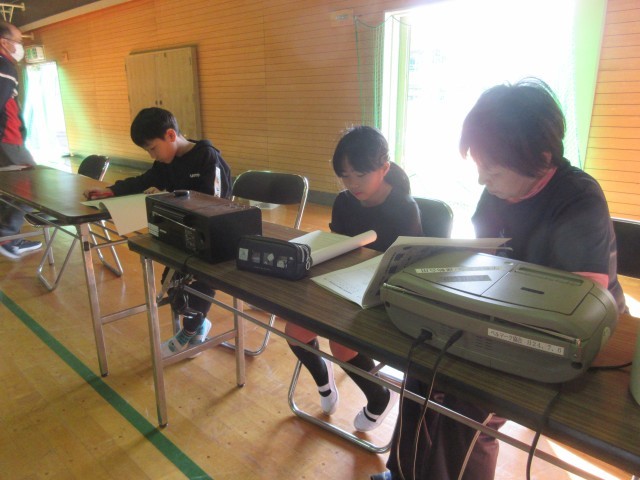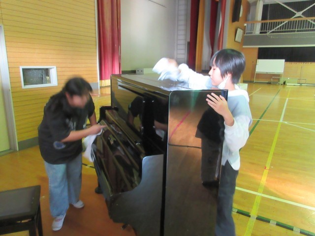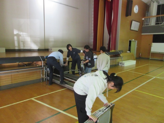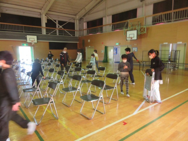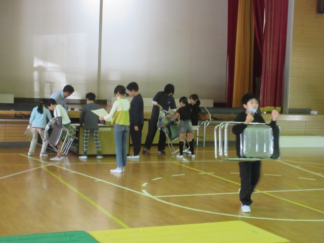 6校時の時間帯に、4~6年生と職員で学習発表会に向けた会場づくりを行いました。