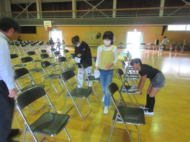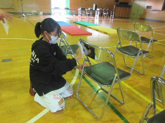 はじめに、作業の内容について担当の先生から話を聞き、けがをしないように気を付けながら作業を開始しました。パイプいすを運んで並べた後に丁寧に座面を水拭きをしたり、重い長机を校舎から運んできて配置したりと、少ない人数でよく働いてくれました。今年度の学習発表会を成功させようと、頑張ってくれた子どもたちでした。