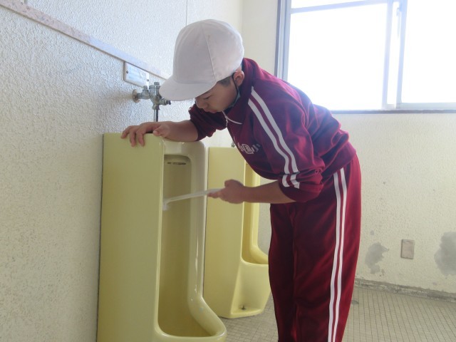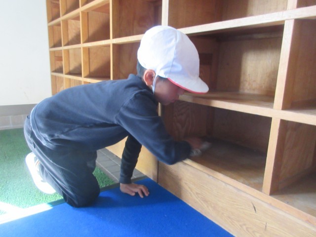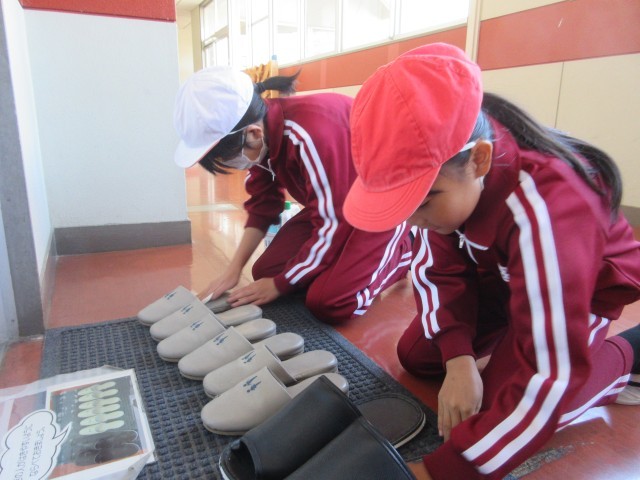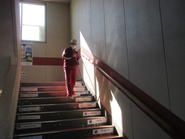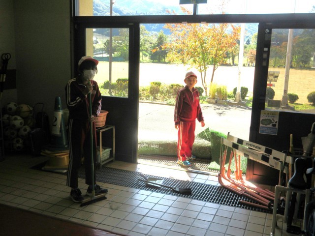 土曜日、たくさんの地域の方々を気持ちよくお迎えできるよう、体育館の玄関も一生懸命にお掃除しています。