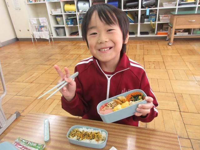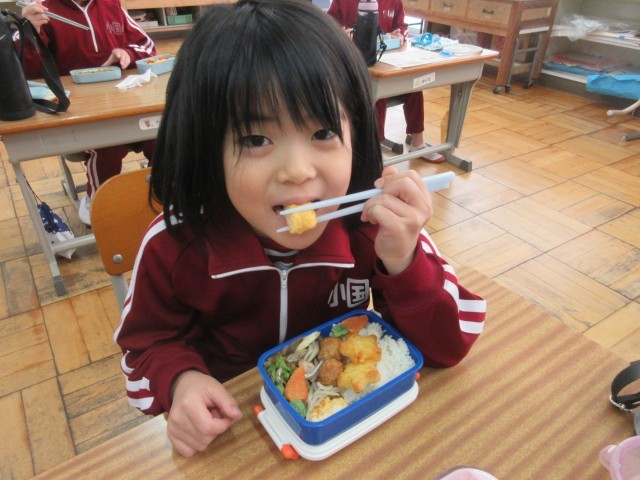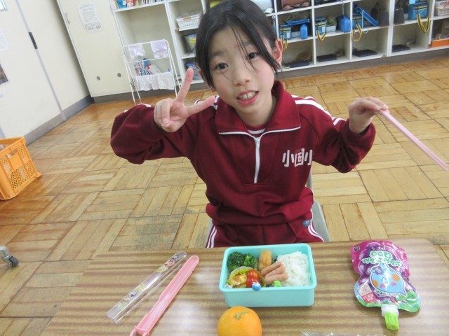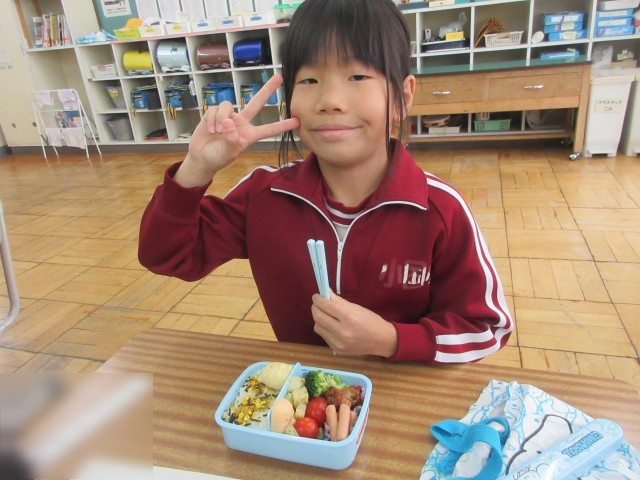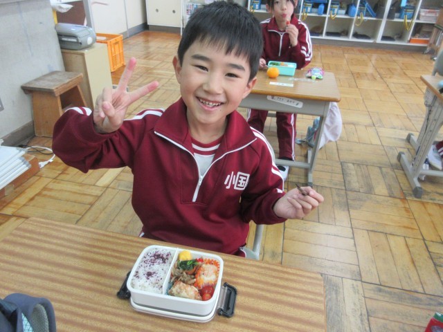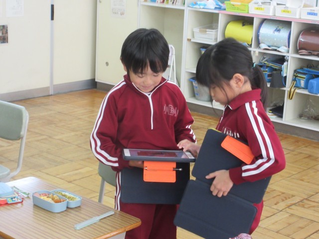 どんな様子かなと教室を訪問してみると、お弁当を開けてタブレットで撮影していました。