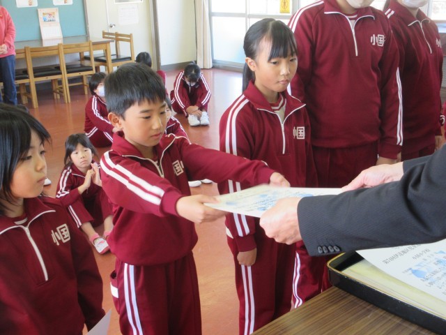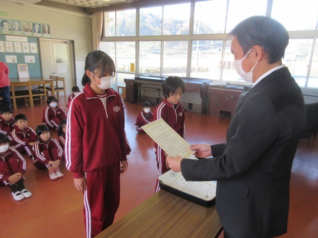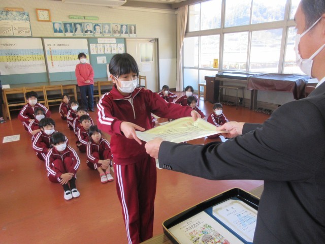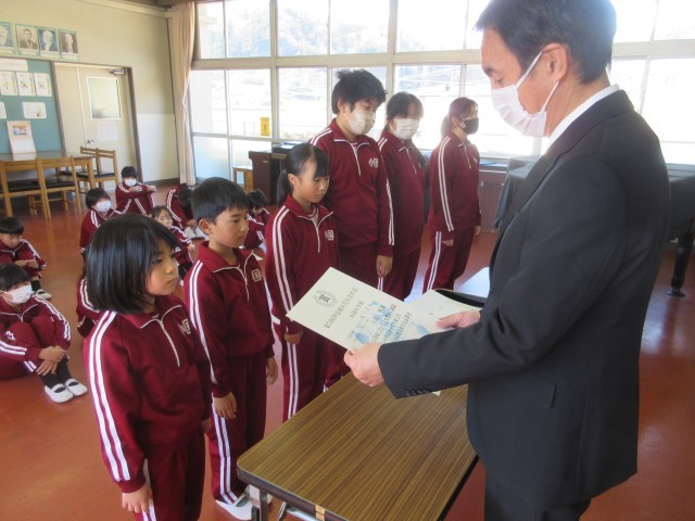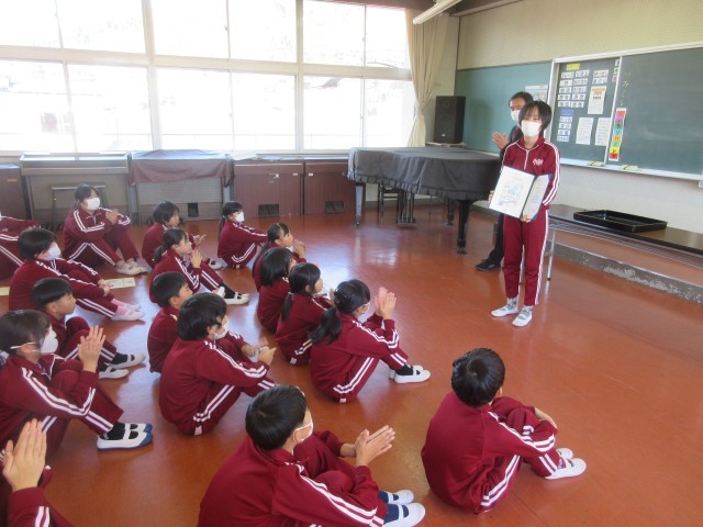 はじめに、賞状の伝達を行いました。校内の歯の表彰のほか、地区造形展、作文や絵画関係のコンクールで入賞した児童を紹介しながら、賞状を伝達しました。昨年度に比べて、この時期に入賞した児童が多く感じており、子どもたちの活躍をたいへんうれしく思っております。