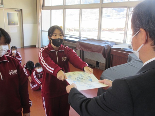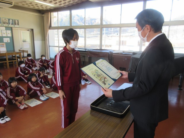 賞状を伝達した後の話しでは、今日から12月ということで、カレンダーが残り1枚になり、令和7年度の締めくくりの月になることを伝えました。また、「師走」とも言われる由来についても話しをして、気ぜわしい師走だからこそ心を落ち着けて生活し、事故無く2学期を終了できるようにしてほしいことを伝えました。