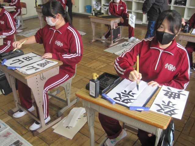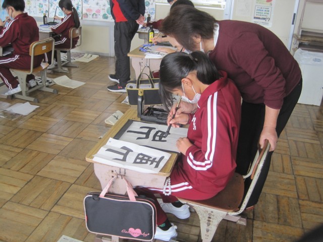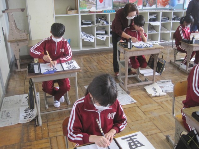 3・4校時、5・6年生を対象に特別非常勤の先生による書写の学習を行いました。今回は、かきぞめ展に向けて、お手本に示された文字の特徴を確認した後、実際の練習に入りました。子どもたちは、一画一画、お手本をよく見ながら丁寧に書いていました。先生のアドバイスもよく理解することで、字形も次第に整ってきていました。集中して、落ち着いて書いていたと先生からもお褒めのことばをいただきました。今日、ご指導いただいたことをもとに、冬休みには各家庭でもかきぞめに取り組んで、冬休み明けに作品を提出するようになります。