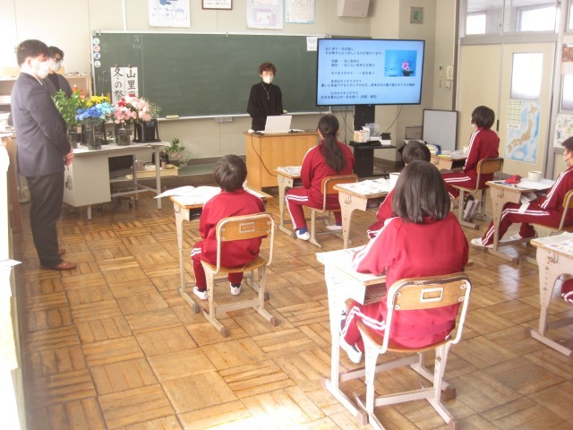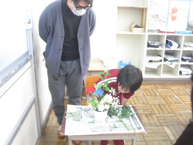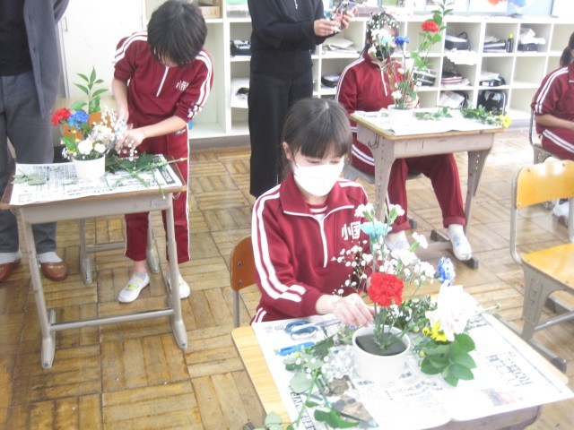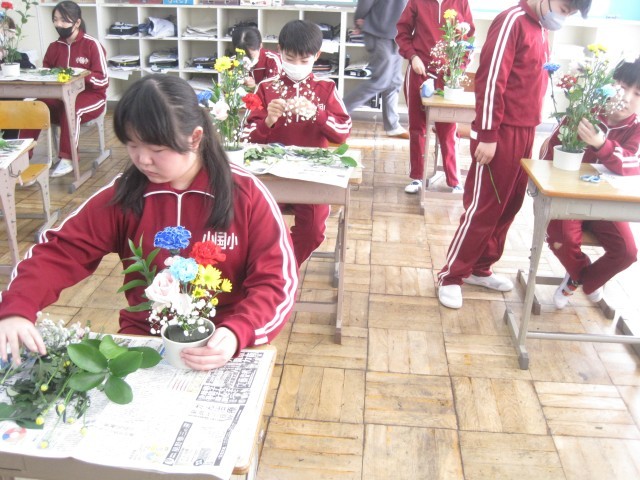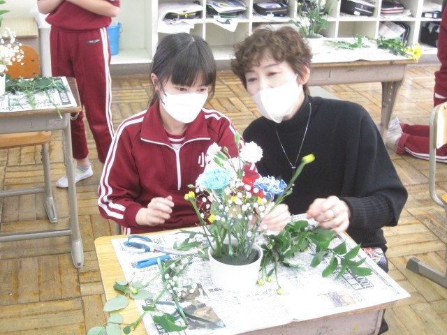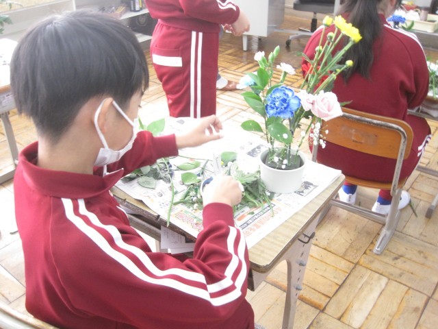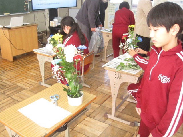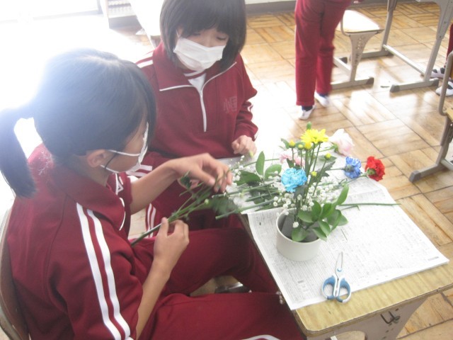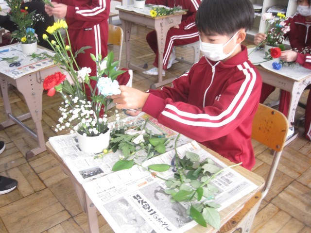 県の花育事業を活用させていただき、5・6年児童がフラワーアレンジメントに挑戦しました。講師は、市内で花屋さんを営んでいる方々で、はじめに花に関するさまざまな話題をしていただいた後で、アレンジメントづくりに取り掛かりました。選ぶ花も、花の丈も、それぞれに違い、子どもたち一人一人の思いが表現されてた作品となりました。