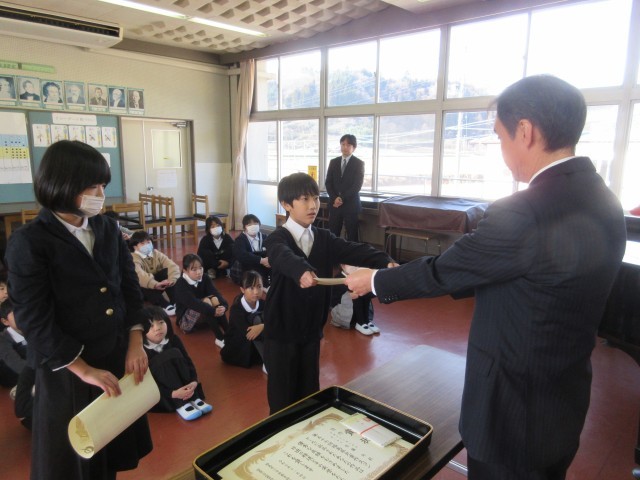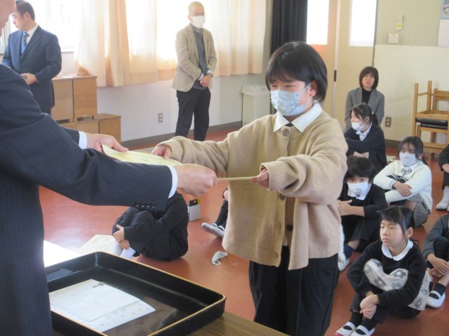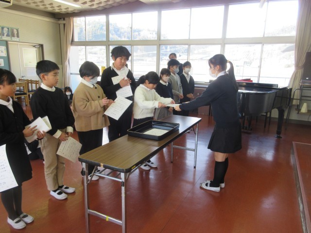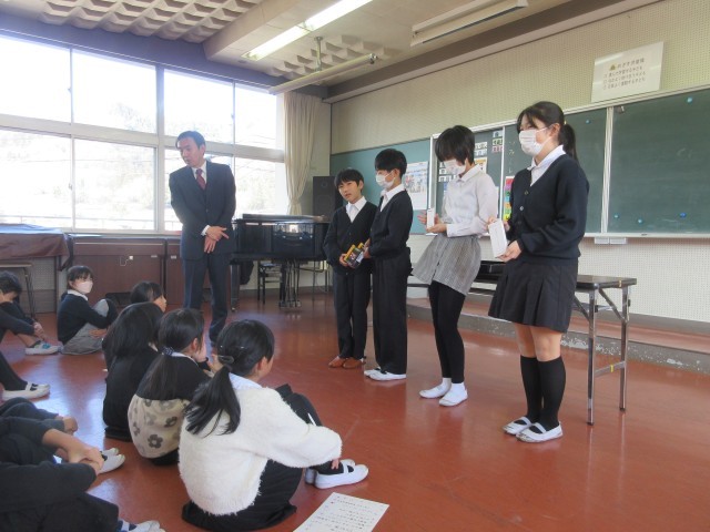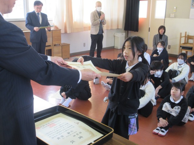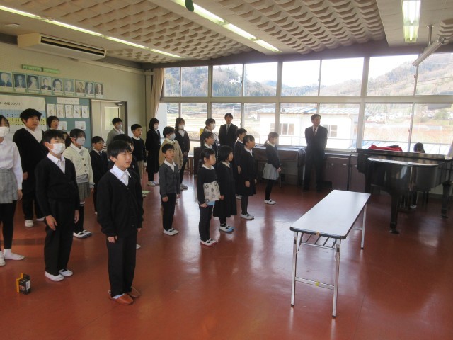 終業式では、2学期の行事などを振り返りながら、子どもたち一人一人が頑張ったことを確認しました。中でも、学習発表会で一人一人が堂々と表現できた姿を称賛し、この表現力を小国小一人一人の強みとして、3学期も授業をはじめとする様々な場面で活躍してほしいことを伝えました。