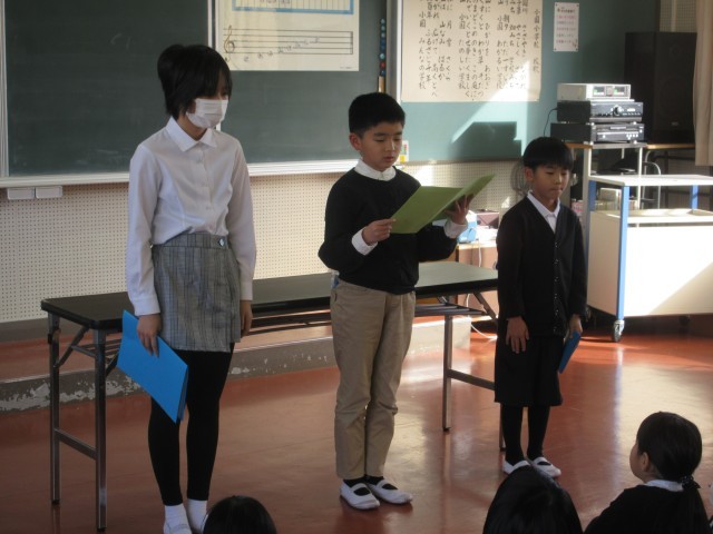 また、児童3人の作文発表では、2学期の学校生活で頑張ったこと、冬休みに取り組みたいことをしっかり伝えることができていました。子どもたちの作文発表からも、めあてに向かって頑張った2学期だったことが分かりました。