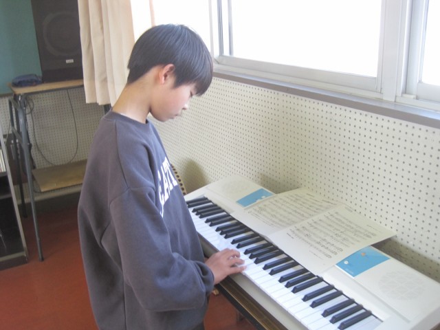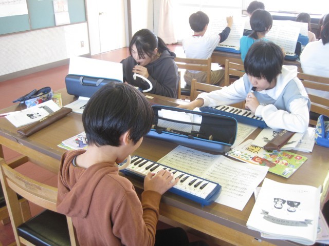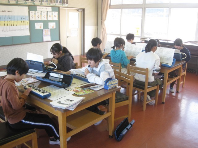 5校時、5・6年生は音楽室で音楽の授業でした。卒業式で歌う曲が決まり、その練習に入りました。後半は、合奏曲「ルパン三世」の主旋律を鍵盤ハーモニカで練習していました。
