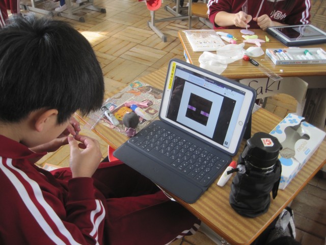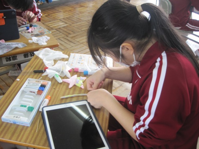 5・6年生は、図工で紙粘土を使った作品づくりに取り組んでいました。絵の具を混ぜて作った紙粘土の組み合わせを工夫しながら、集中して作品づくりに取り組んでいました。