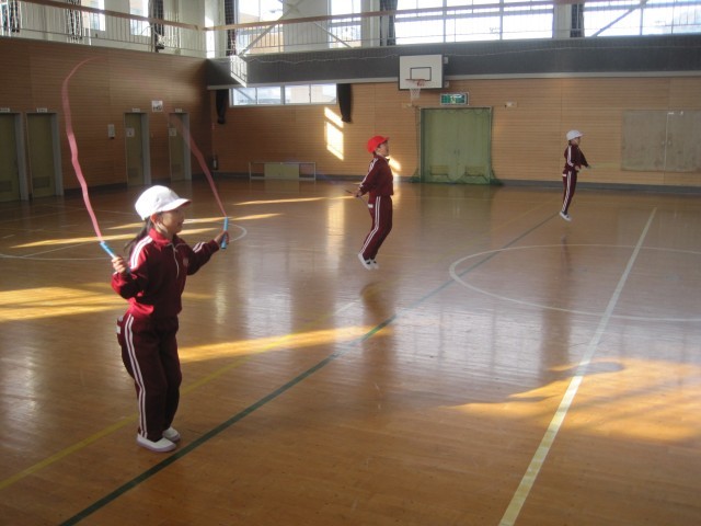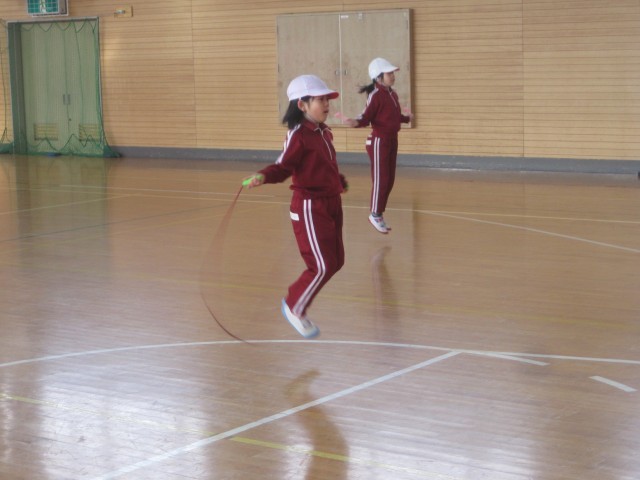 2校時、1・2年生は体育館で体育の授業でした。準備運動をした後、縄跳びの持久跳びに取り組みました。1年生の目標時間は1分間、2年生は2分間です。それぞれの目標時間をクリアできるように頑張って跳んでいる様子が見られました。「今日はじめて2分間跳べた!」と嬉しそうに声を上げていた2年生もいたようです。