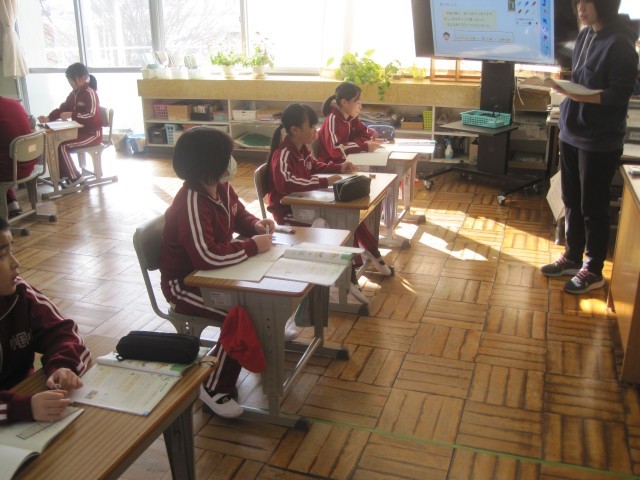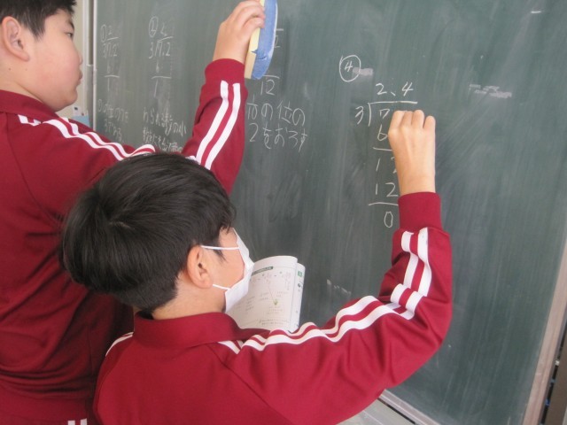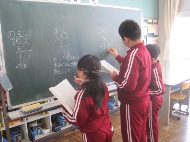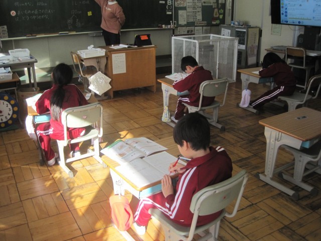 寒い一日でしたが、子どもたちは元気に登校し、1校時の授業から落ち着いて取り組んでいました。2年生の算数では、120㎝を「m」と「㎝」を使った長さの表し方を学習していました。4年生の算数では、小数÷整数のひっ算の計算の仕方を子ども同士で確認しながら学習を進めていました。