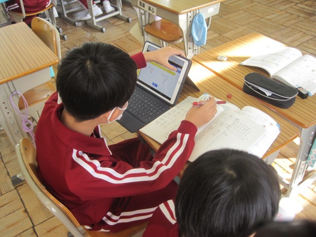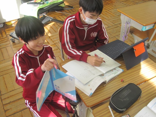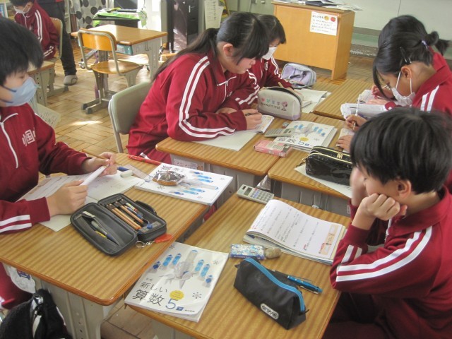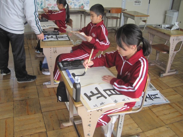 2校時の授業の様子です。1・2年生は、記録更新を目指して縄跳びの持久跳びに挑戦していました。友達の応援を励みに頑張っていました。3年生は書写で毛筆の学習、4年生はALTの先生と一緒に外国語活動の学習でした。そして、5・6年生は算数の授業で、楽しそうに習熟の問題に取り組んでいました。