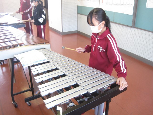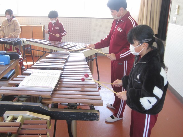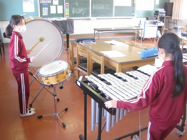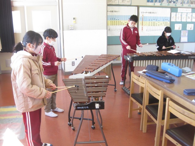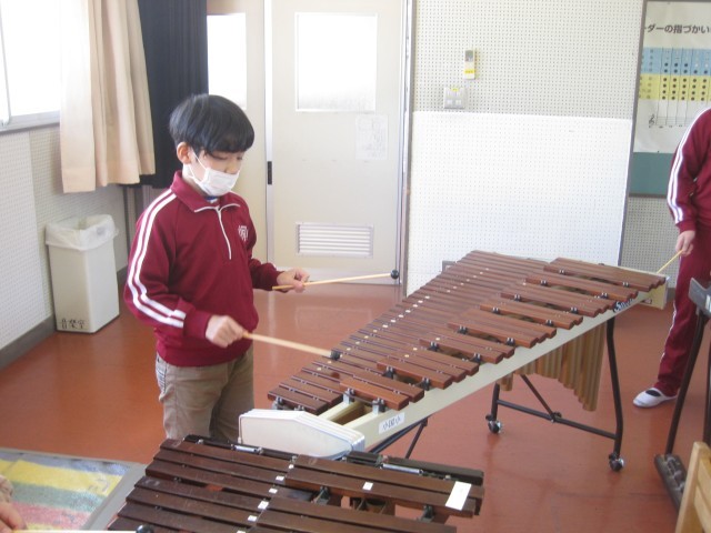 2校時、音楽室では3・4年生が打楽器を使って合奏の学習をしていました。3年生は、欠席した友達の分も頑張って大太鼓と小太鼓の両方を使って、上手にリズムを奏でていました。また、木琴や鉄琴の奏法にも慣れ、きれいな音色を響かせていました。