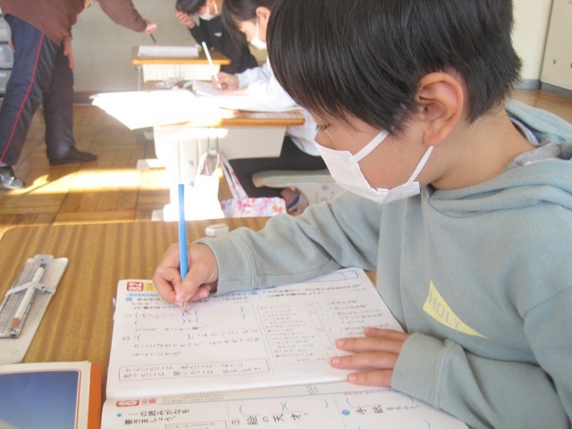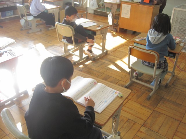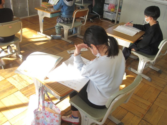 5校時、1・2年生はまとめのドリルを使ってこれまでに学習したことの復習に取り組んでいました。「詩」は、感じたことや思ったこと、見たり聞いたりしたことを短い言葉を使って表すことをみんなで確認していました。