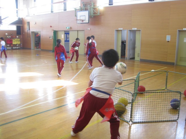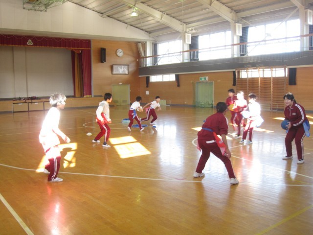 5・6年生は、体育館でフラッグフットボールのゲームをしていました。確認したルールを基に、攻めと守りのチームに分かれ、それぞれに作戦を立てて楽しく活動していました。2月13日(金)には、このフラッグフットボールを掛田小学校の5・6年生とで行うことを計画しています。