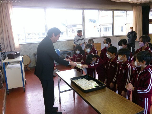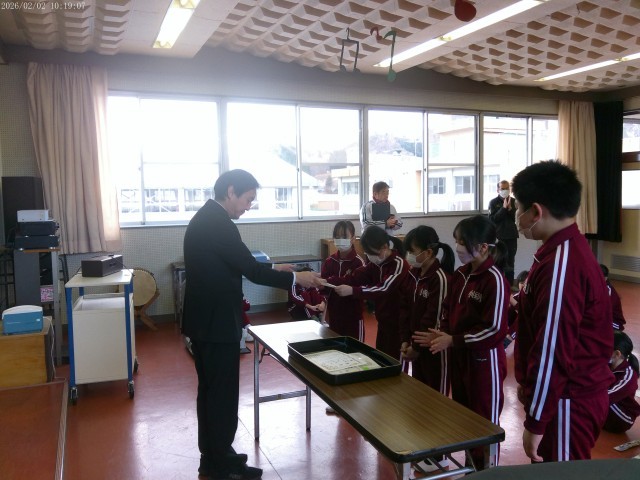 今回は、冬休み明けに実施した「第2回漢字・計算大会」で、優れた成績をおさめた児童に賞状を授与して称賛しました。