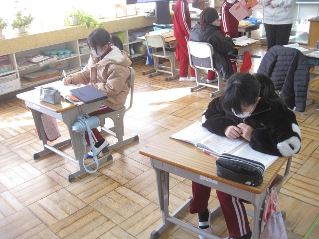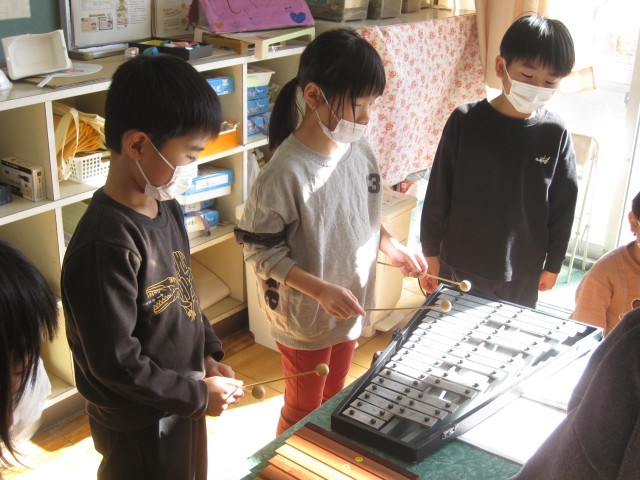 5校時、1・2年教室から明るい歌声とともに鉄琴の音色が聞こえてきました。教室を訪問してみると、CDの音楽に合わせて鉄琴や木琴の旋律を演奏していました。友達の歌声やCDの伴奏をよく聴きながら上手に演奏していました。5・6年生は、今週末に掛田小学校で行うフラッグフットボールのゲームを楽しそうに行っていました。