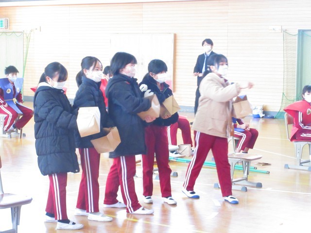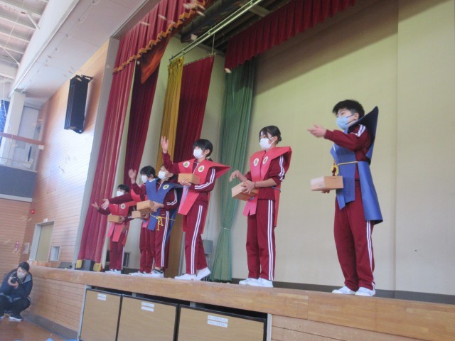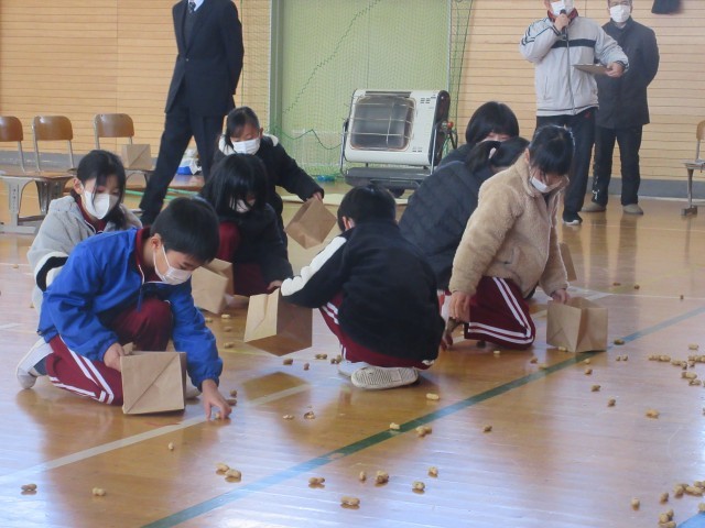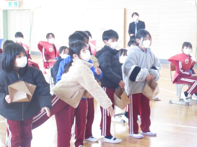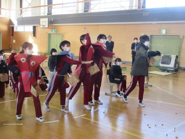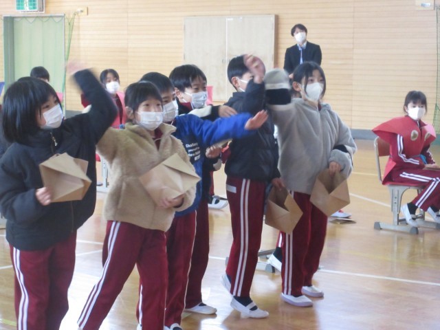 3校時、体育館で節分交流会を行いました。これは、本校で毎年行われている地域の老人クラブ「千寿会」の皆様との交流を図ることを目的とした豆まき集会です。今年も千寿会様より落花生をいただき、伝統行事である豆まきを行い、児童一人一人の心の鬼退治をしました。明日は、立春。小国小学校にも素敵な春が訪れることを祈っています。