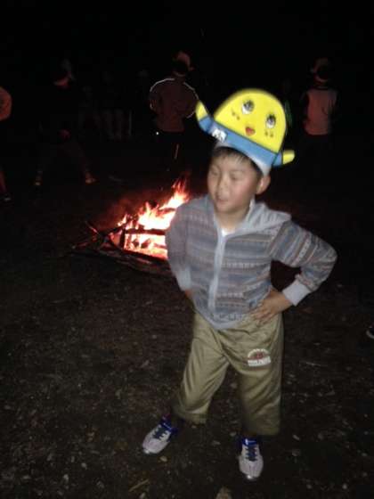 石田小、大石小の友だちとキャンプファイヤーを楽しみました。小国小はダンスが得意です。腰の振り方がとても上手なのです。