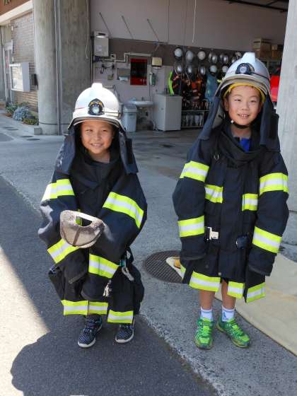 消防服を着させていただきました。とても重かったです。はしご車は高いところまでとどきます。どれも「すごいなあ」の一言です。