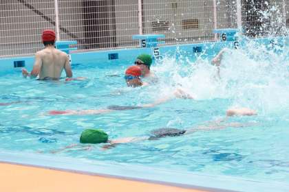 中・高学年は水の感触を確かめながら初泳ぎを体験しました。小国小のプールに海坊主を発見しました。泳げないと「沈めるぞ!」と脅すそうです。