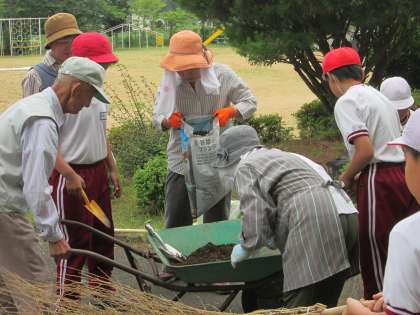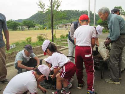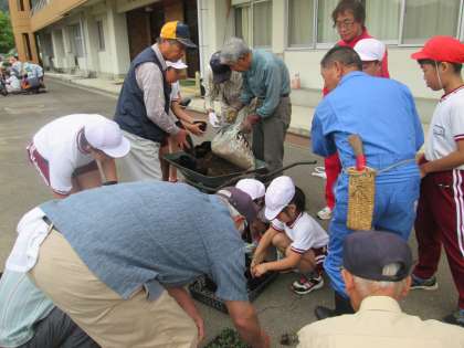 子どもたちが種から育てた苗です。おじいちゃん、おばあちゃんと一緒にポットに移しました。一緒に作業を手伝っていただきありがとうございました。