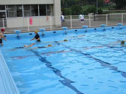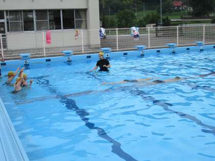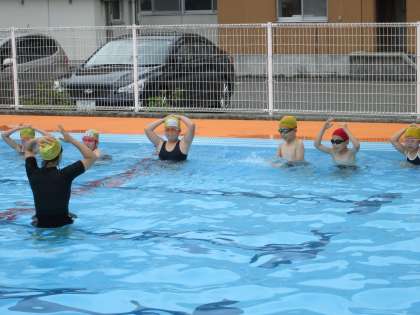 3・4年生は、泳ぎの基本である伏し浮きを練習しています。壁をけってプールの横の半分まで行くことが目標です。
