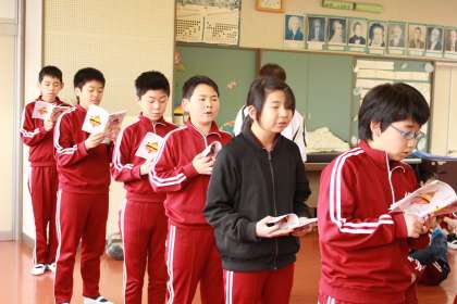 校長講話の後、卒業式で歌う歌の練習を行いました。卒業生の歌、在校生の歌そして全員で歌う歌を大きな声で歌います。でも、今日はいつもより元気がなかったかな!次は、頑張ろう!
