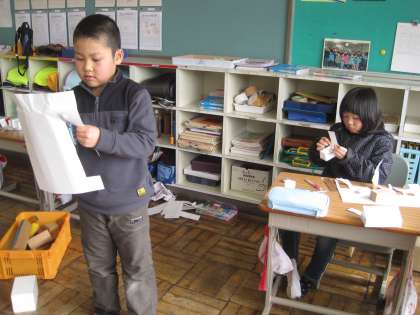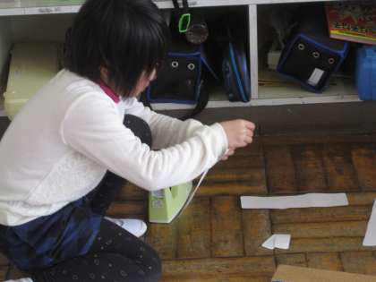 2年生は、画用紙を組み合わせて、四角形や三角形を作っています。器用にはさみで紙を切りながら、自分のイメージに合わせて作成していきます。ガンバレ!