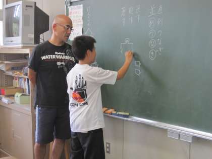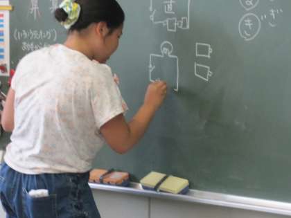 6年生は、漢字の書き順を復習しています。「並」という漢字から、理科の授業で学習した「並列つながり」を例に挙げて、子どもたちに並列と直列を主出させて、実際に豆電球の回路図に並列と直列つなぎを書かせます。子どもたちは、真剣に取り組んでいました。