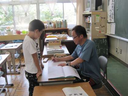 5年生は、国語のテストを終え、担任と一緒に考えながら採点しています。