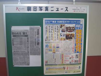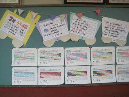 放送室前の掲示板には、全校生がチャレンジしている「マラソンカード」が貼られています。一ます200mで、すべてのますを染めるとフルマラソン(42.195 km)を完走したことになります。ガンバレ小国っ子!