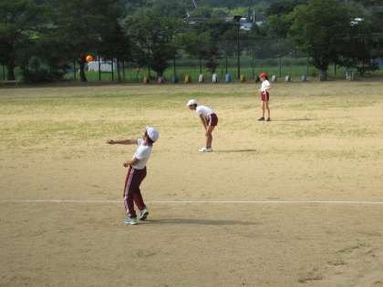 持久走〜雲梯〜タイヤ跳びそして、鉄棒〜ボール投げと続きます。鉄棒では、5・6年生が1・2年生の補助をしています。微笑ましい光景です。
